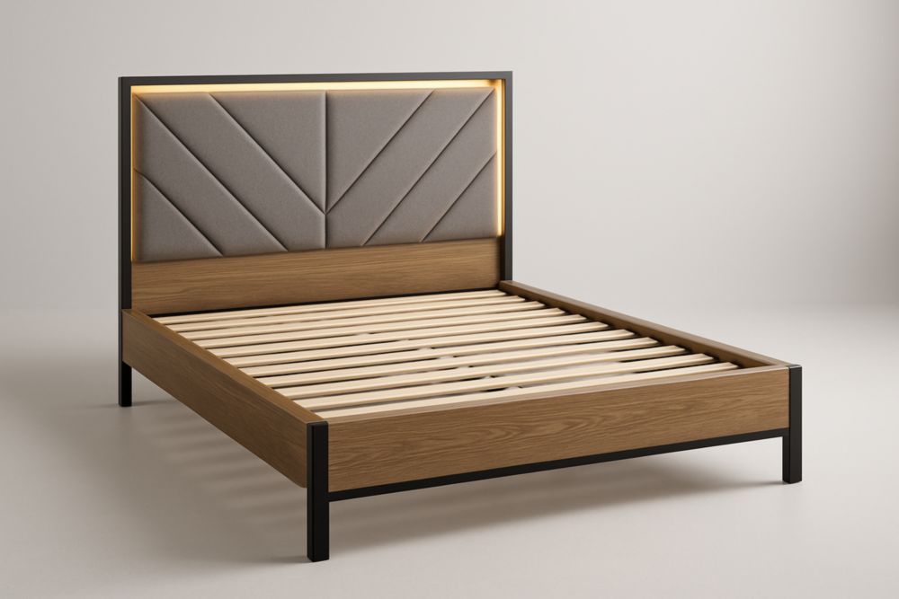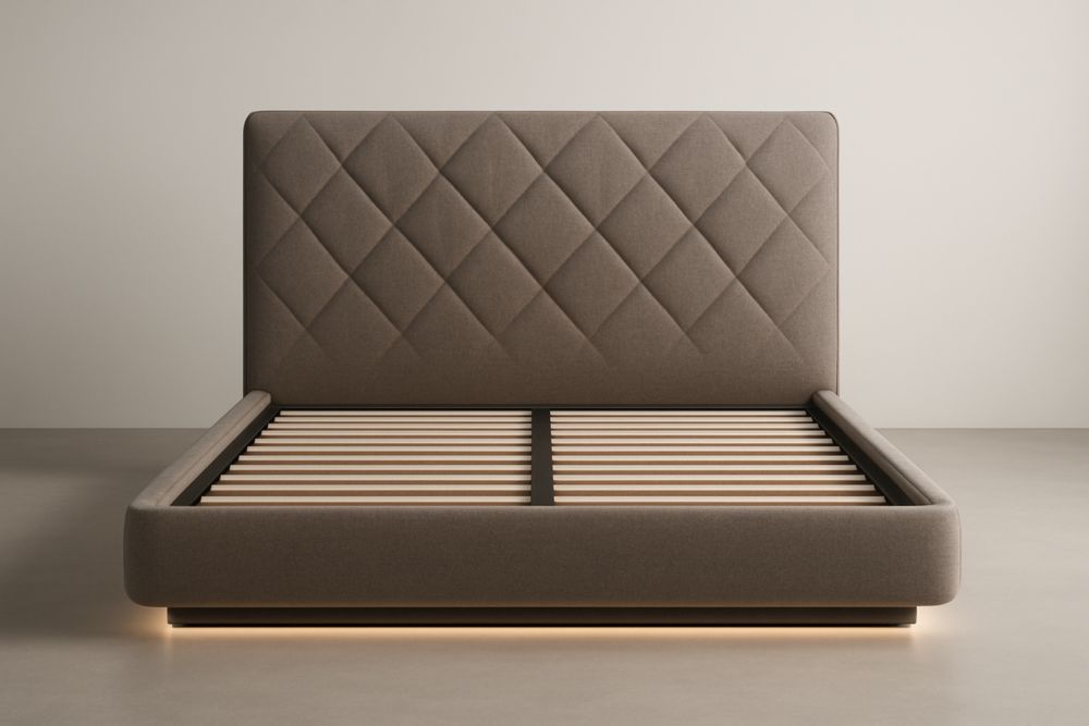 Letto imbottito in tessuto marrone con doghe in legno