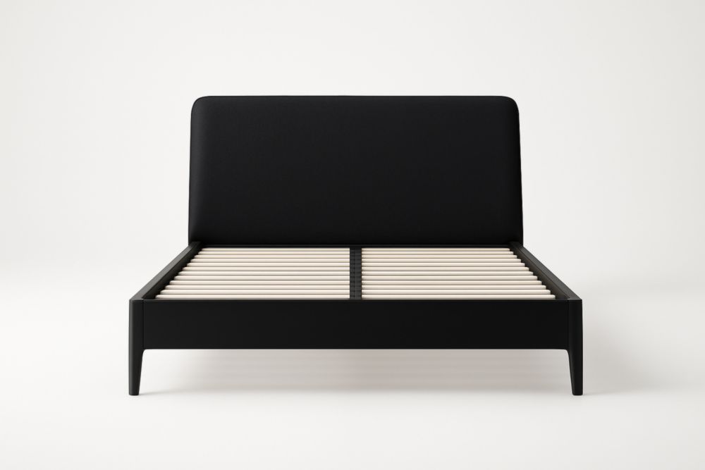 Letto matrimoniale in pelle sintetica nera con doghe in legno