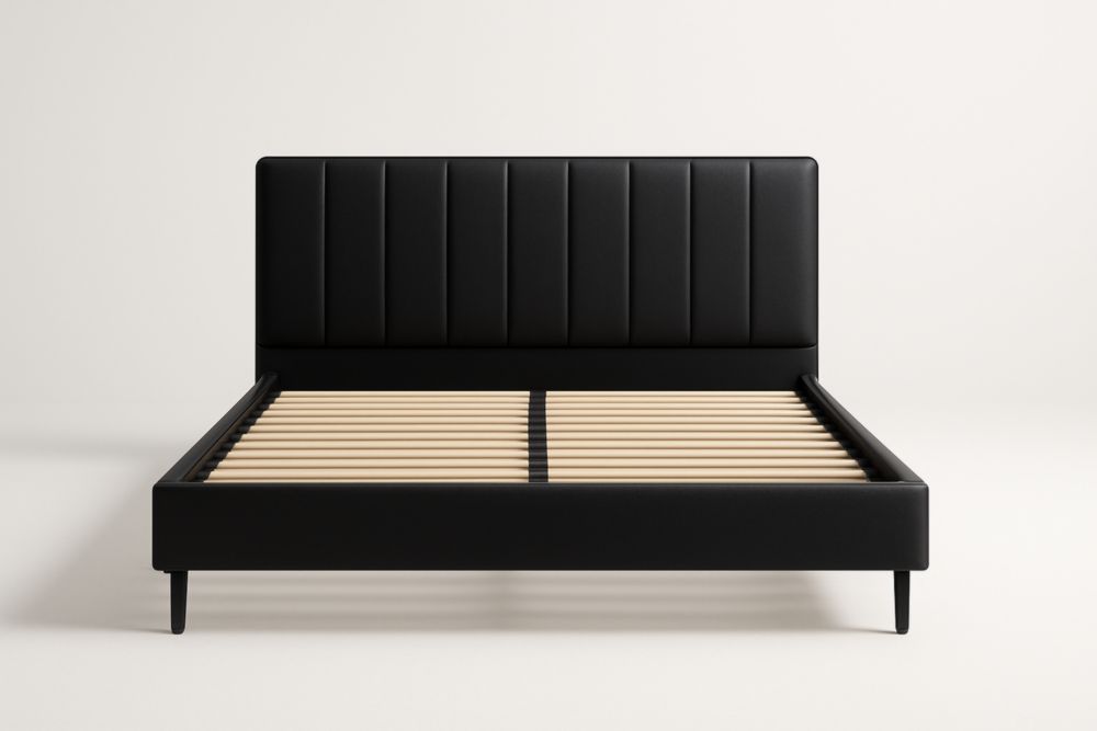 Letto matrimoniale in pelle sintetica nera con doghe in legno
